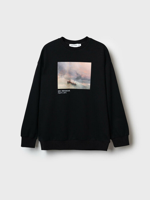 Свитшот оверсайз для мальчика подростка. Выполнен из хлопкового футера без начеса. На груди расположен крупный принт — репродукция картины Айвазовского «Радуга». Под изображением — подпись с названием и датой создания картины. Горловина, манжеты и низ изделия оформлены эластичными резинками. Можно составить family look cо взрослым вариантом аналогичного дизайна.