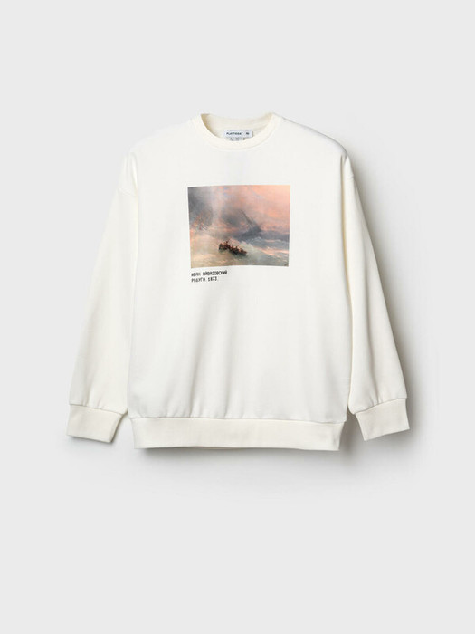 Свитшот оверсайз для мальчика подростка. Выполнен из хлопкового футера без начеса. На груди расположен крупный принт — репродукция картины Айвазовского «Радуга». Под изображением — подпись с названием и датой создания картины. Горловина, манжеты и низ изделия оформлены эластичными резинками. Можно составить family look cо взрослым вариантом аналогичного дизайна.