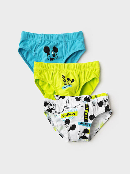 Набор из трех детских трусов-брифов для мальчика . У изделий удобный эластичный пояс, мягкие обработанные края пройм и анатомическая вставка спереди. Такой крой обеспечивает хорошую посадку и комфорт в носке. Принт с любимым мультяшным героем - Микки Маусом. Материал - хлопковый, мягкий трикотаж.