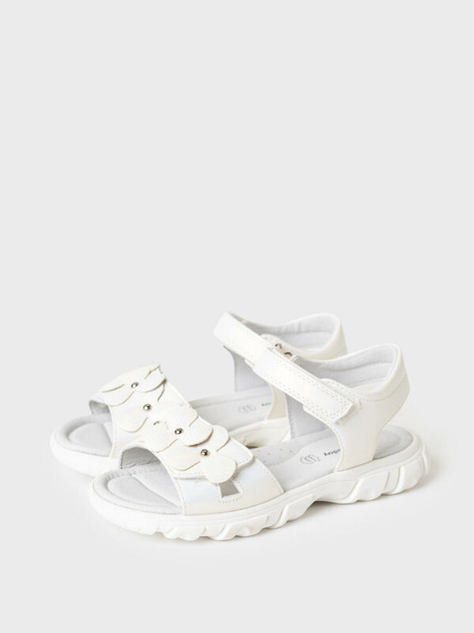 Нарядные белые сандалии для девочки. Босоножки выполнены из перламутровой искусственной кожи и декорированы крупными цветами. Удобные ремни с липучками позволяют регулировать обувь на любой подъем. Подкладка и стелька выполнена из натуральной кожи. Стелька имеет анатомический элемент для поддержания свода стопы в правильном положении. Модель имеет гибкую и легкую подошва из ТПР с противоскользящим протектором.