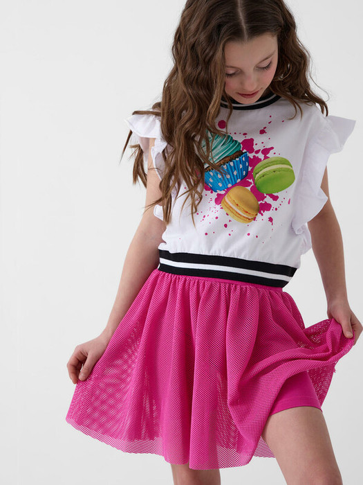 Юбка-леггинсы для девочки подростка. Верхняя часть выполнена из легкой сетчатой ткани, под ней — плотные трикотажные укороченные леггинсы. Широкий пояс держится за счёт внутренней резинки. Длина юбки — до середины бедра.