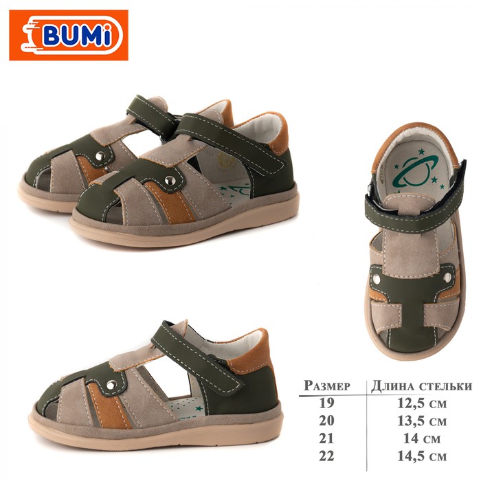 Сандали Bumi на липучке выполнены из натуральной и искусственной кожи.