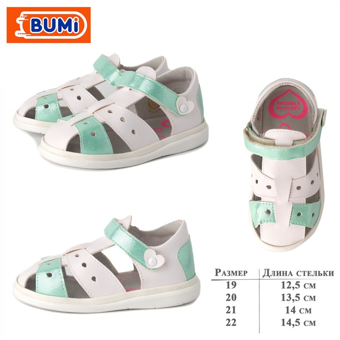 Сандали Bumi на липучке выполнены из натуральной и искусственной кожи.