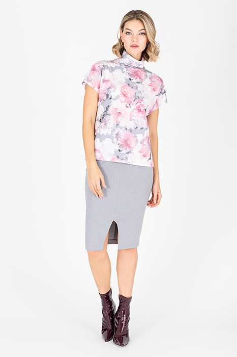 Комбинированный костюм из юбки и джемпера. Юбка прилегающего силуэта из эластичного полотна с жаккардовым узором Пье-де-пуль. На переднем полотнище юбки выполнен шов с разрезом. Пояс с эластичной резиной обеспечивает хорошую посадку по фигуре. Джемпер свободного силуэта с цельнокроеным коротким рукавом. Вырез горловины оформлен воротником-стойкой.