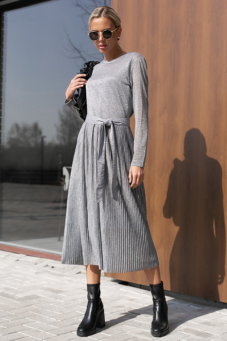 Нарядное двойное платье из мягкого эластичного полотна с деликатным блеском и эластичного полотна. Верхнее платье, отрезное по линии талии. Полуприлегающий лиф с круглой горловиной окантованной бейкой и втачным удлиненным рукавом. Летящая юбка из ткани-компаньона с эффектом "гофре". Пояс в комплекте. (Люриксовая нить, входящая в состав ткани, очень мягкая. Ткань тактильно приятная, не колется).