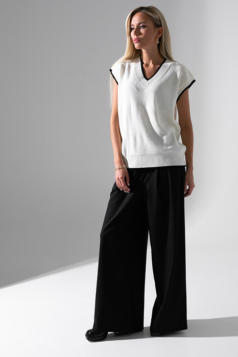 Брюки прямого силуэта выполнены из костюмной ткани. На передней половинке по линии талии застрочены складки. На задней половинке - талиевые вытачки. Карманы с подкройным бочком. Притачной пояс со шлёвками. Застёжка на молнию-гульфик и пуговицу. Такой крой выгодно подчеркнёт длину ваших ног.