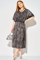 Платье приталенного силуэта из вискозной плательной ткани. Изделие отрезное по линии талии с защипами. В боковых швах карманы. Втачной короткий рукав. Притачная планка с застёжкой на пуговицы. Вырез горловины обработан отложным воротником на стойке. В комплекте пояс из основной ткани.