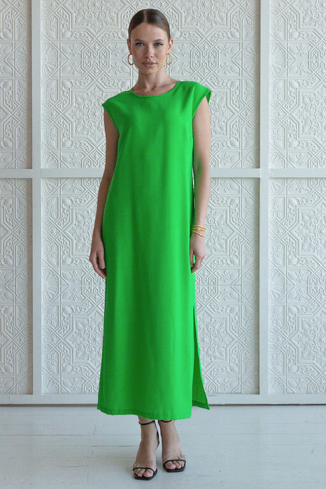 Платье из вискозной ткани с крэш-эффектом. Полуприлегающий силуэт, с разрезом в боковом шве. По среднему шву спинки застёжка на петлю-пуговицу. Круглый вырез горловины и линия проймы окантованы косыми бейками из основной ткани.