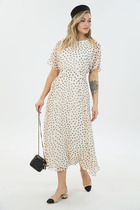 Платье свободного силуэта из вискозной плательной ткани. Изделие отрезное по линии талии, с ярусами на юбке. Лиф с застёжкой на пуговицы. Вырез горловины обработан воротником-стойкой. Линии проймы окантованы косыми бейками из основной ткани. В комплекте пояс из основной ткани. В таблице размеров представлены параметры человека, а не изделия.