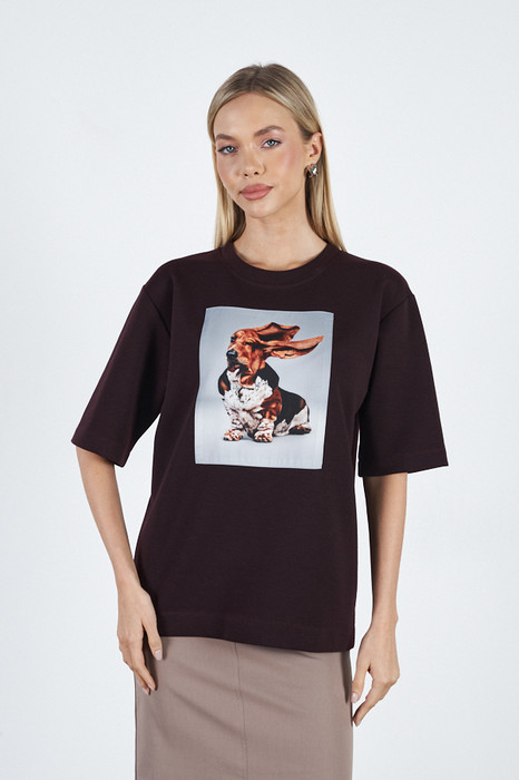 Джемпер свободного силуэта из эластичного полотна. Короткий втачной рукав в спущенную пройму. Вырез горловины оформлен бейкой. На передней части изделия выполнена аппликация.