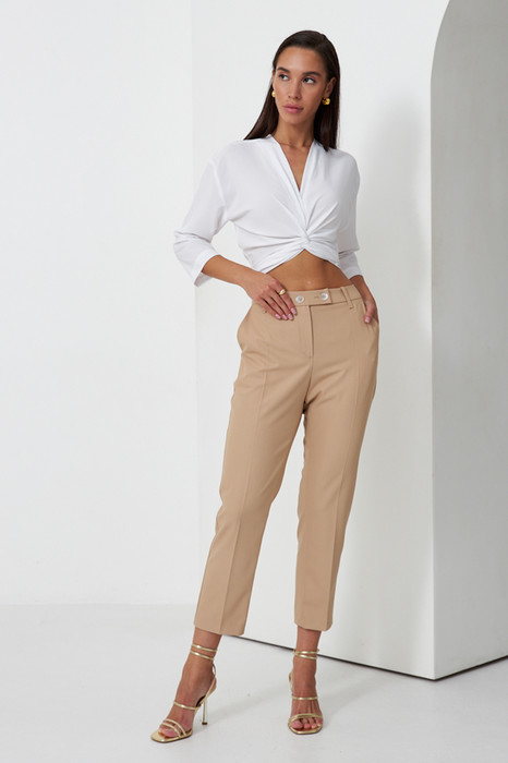 Брюки прямого силуэта, зауженные книзу из костюмной ткани. Застёжка на молнию-гульфик и пуговицу. Карманы с подкройным бочком. Притачной пояс со шлёвками.