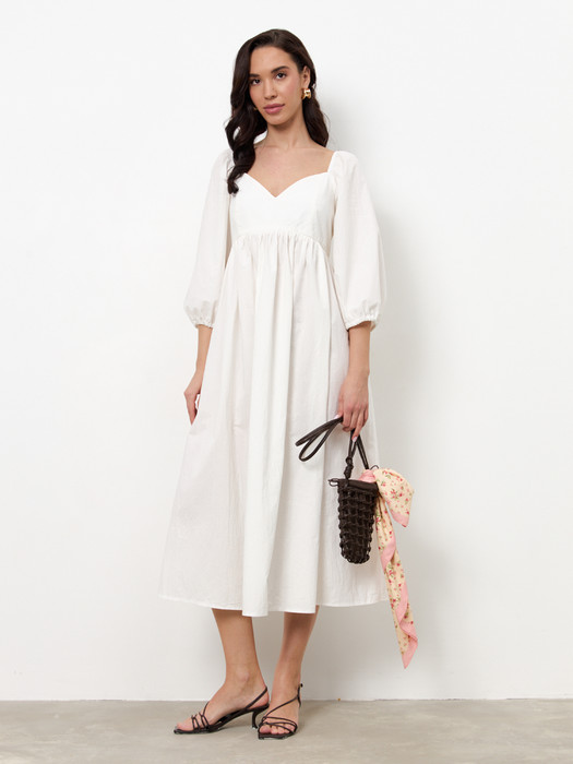Платье свободного силуэта из хлопковой ткани. Изделие отрезное по линии талии. Линия талия завышена и фигурная. Верхняя часть юбки со сборкой. По среднему шву спинки потайная молния. Лиф переда и спинки двухслойный, имеет рельефные швы. Окат рукава и низ рукава зафиксированы резиной.