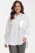 Блуза из вискозной ткани с сатиновым блеском. Свободный силуэт с разрезами в боковых швах и застёжкой на пуговицы. На задней части изделия выполнена кокетка с небольшой складкой. Вырез горловины обработан отложным воротником на стойке. Втачной рукав на манжете с застёжкой на пуговицы. Изделие украшено съемной планкой с перьями. Перед стиркой планку с перьями необходимо снять.