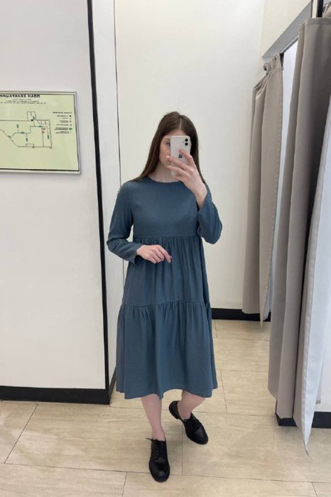 Платье очень свободного силуэта из вискозной ткани с крэш-эффектом. Изделие отрезное по линии талии, с ярусами на юбке. Линия талия завышена. Втачной длинный рукав. Круглый вырез горловины, сзади застёжка на петлю-пуговицу. Низ изделия асимметричной длины (спинка удлинена относительно переда). В таблице размеров представлены параметры человека, а не изделия.