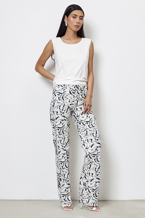 Брюки прямого силуэта из хлопковой ткани. Пояс притачной с эластичной резиной. На передней части брюк застрочены стрелки.