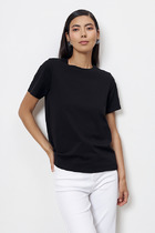 Рубашка из вискозной ткани с крэш-эффектом. Свободный силуэт с разрезами в боковых швах и застёжкой на планке. Вырез горловины обработан отложным воротником на стойке. Короткий рубашечный рукав с отворотом. На задней части изделия выполнена кокетка с небольшой складкой. На передней-накладной карман в области груди.