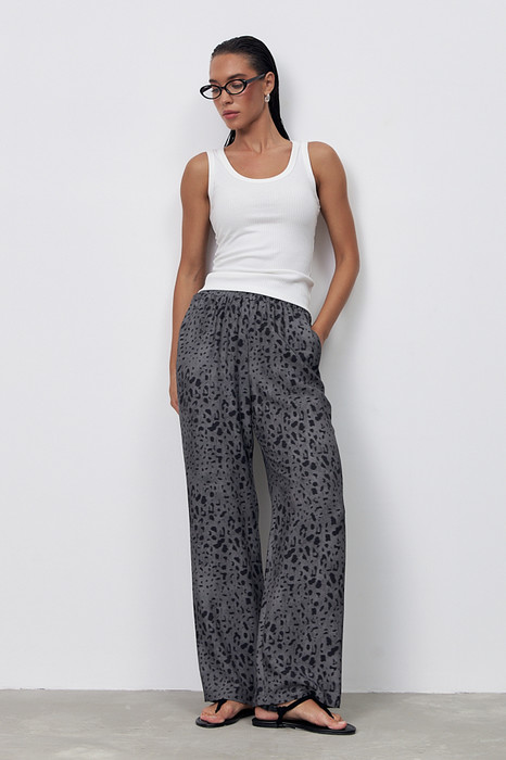 Брюки прямого силуэта из вискозной ткани. Пояс притачной с эластичной резиной, в боковых швах карманы.