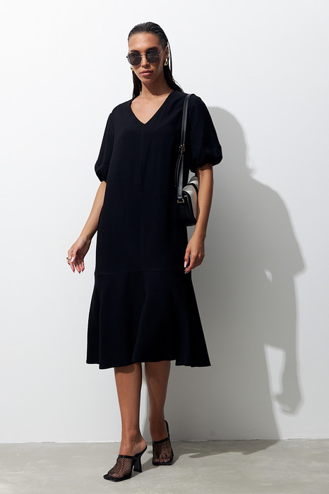 Платье свободного силуэта из вискозной ткани с крэш-эффектом. По центру передней части изделия и спинки выполнен шов. Цельнокроеная стойка, переходящая в V-образный вырез горловины, визуально делает фигуру стройнее. Втачной короткий рукав, по низу рукава сборка на резину. Низ изделия украшен широким воланом.