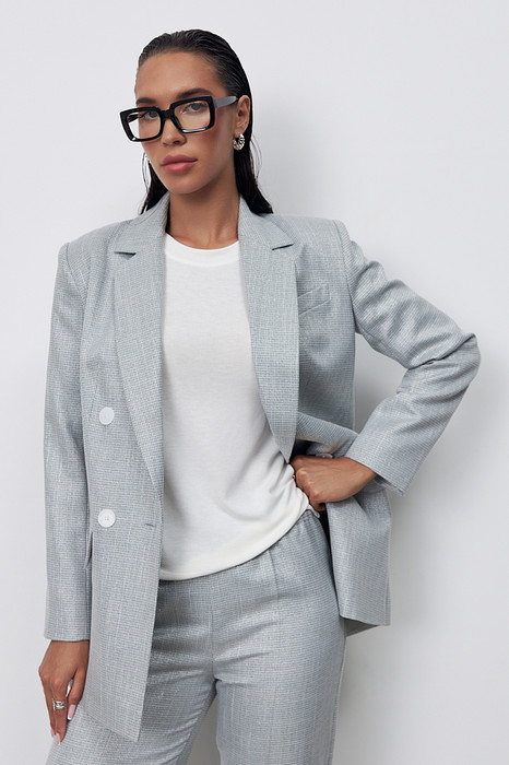 Двубортный жакет из костюмной ткани. Изделие полуприлегающего силуэта с английским воротником и застежкой на пуговицы. На передней части жакета выполнен нагрудный карман с листочкой и карманы в рамку с клапаном. По центру задней части выполнена шлица - элемент декоративный и необходимый. Обеспечивает свободу движения, добавляет шику и элегантности. Втачной длинный рукав, снизу имитация шлицы с пуговицами. Изделие идеально держит форму, имеет четкую линию плеча благодаря плечевым накладкам. Жакет на подкладке.