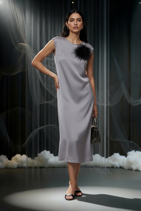 Платье из вискозной ткани с сатиновым блеском. Полуприлегающий силуэт, с разрезом в боковом шве. По среднему шву спинки застёжка на петлю-пуговицу. Круглый вырез горловины и линия проймы окантованы косыми бейками из основной ткани.