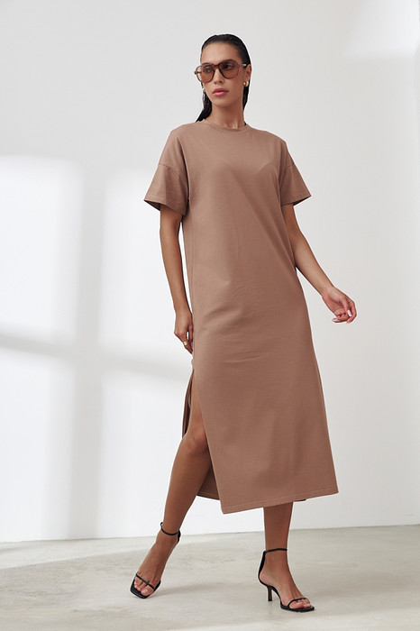 Платье из хлопкового эластичного полотна. Свободный силуэт с разрезами в боковых швах. Короткий втачной рукав в спущенную пройму. Вырез горловины оформлен бейкой.