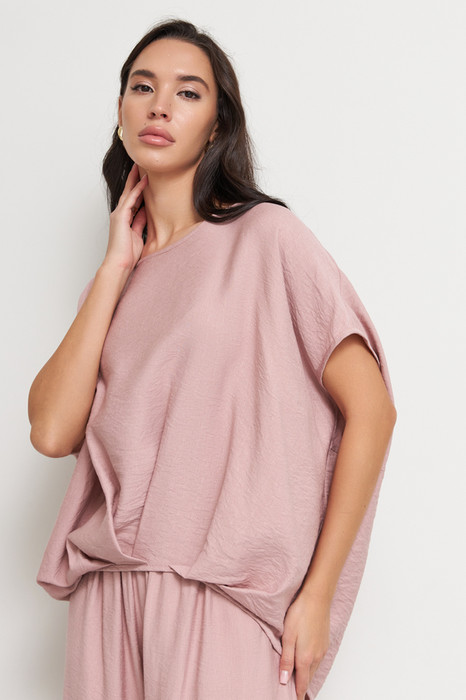 Блуза из вискозной ткани с крэш-эффектом. Свободный крой асимметричной длины (спинка удлинена относительно переда). Спущенное плечо. Линия проймы, линия горловина и низ изделия окантованы косой бейкой из основной ткани. Изюминкой являются оригинальные складки на передней и задней части изделия.