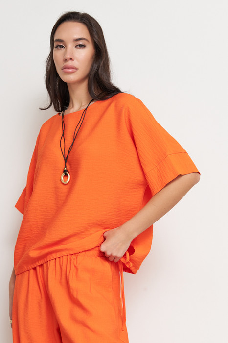 Блуза из вискозной ткани с крэш-эффектом. Очень свободный силуэт с небольшими разрезами по бокам. Круглый вырез горловины. Цельнокроеный рукав с притачной манжетой. Низ изделия затягивается на кулиску.