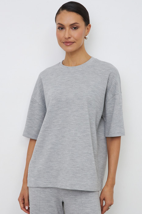 Джемпер свободного силуэта со спущенной линией плеча и рукавом до локтя выполнен из эластичного полотна. Вырез горловины оформлен бейкой из основной ткани. В таблице размеров представлены параметры человека, а не изделия.