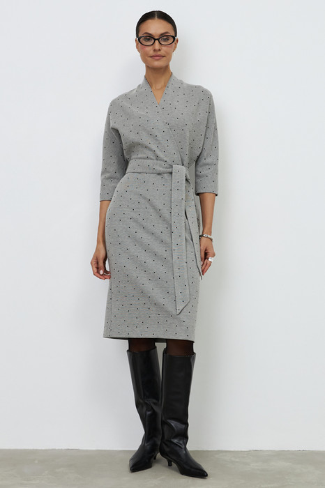 Платье из эластичного полотна. Изделие свободное в верхней части и прилегающее в области талии и бёдер. Лиф изделия оригинального кроя в стиле кимоно. Цельнокроеная стойка переходящая в запах, визуально делает фигуру стройнее. По центру задней части платья выполнен шов, снизу небольшой разрез. В комплекте пояс. В таблице размеров представлены параметры человека, а не изделия.
