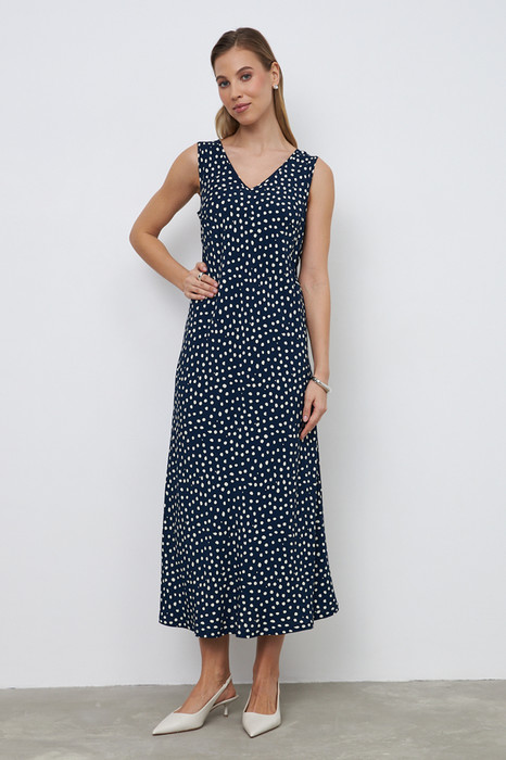 Платье из вискозной ткани полуприлегающего силуэта. Изделие, слегка расширенное книзу. Крой платья по косой. V-образный вырез горловины и линия проймы оформлены косыми бейками.