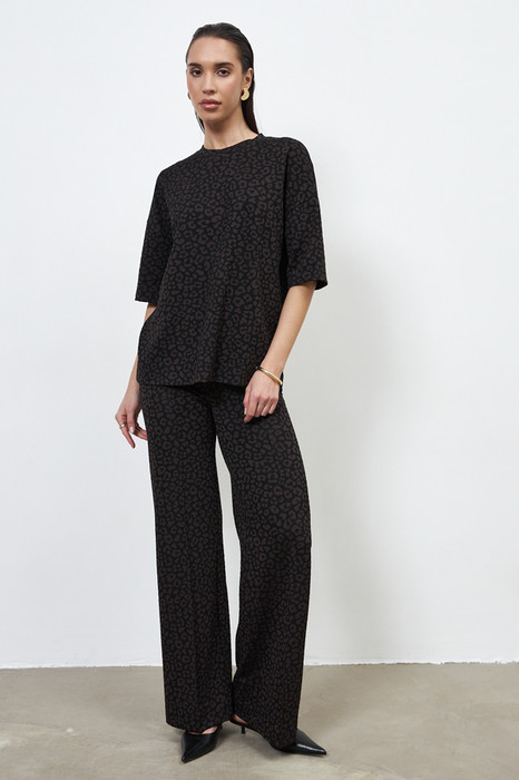 Костюм из эластичного полотна. Джемпер свободного силуэта со спущенной линией плеча и рукавом до локтя. Вырез горловины оформлен бейкой из основной ткани. Брюки прямого силуэта. Пояс притачной с эластичной резиной. На передней части брюк застрочены стрелки.