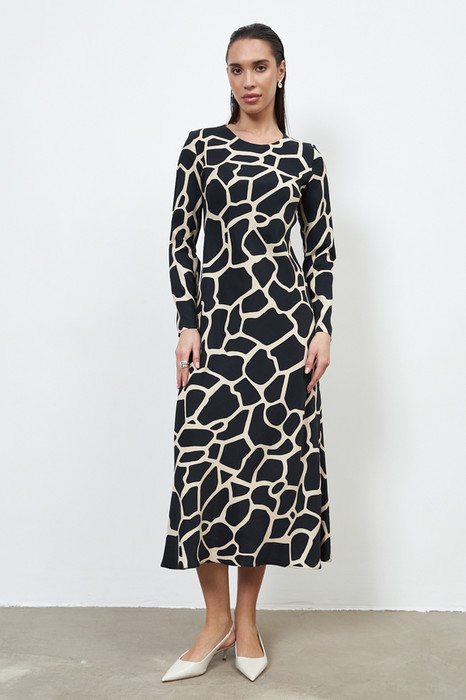 Платье прилегающего силуэта из вискозной ткани. Крой платья по косой. Втачной длинный рукав. Круглый вырез горловины, сзади застёжка на петлю-пуговицу.