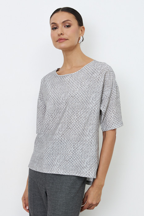 Блуза из вискозной ткани свободного силуэта. Низ изделия асимметричной длины (спинка удлинена относительно переда) с разрезами в боковых швах. Втачной рукав в спущенную пройму. Круглый вырез горловины оформлен косой бейкой из основной ткани.