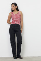 Брюки из денима выполнены по классической джинсовой технологии (варка с эффектом легкого выбеливания). Прямой широкий крой. На задней части брюк выполнены накладные карманы, на передней - карманы с подкройным бочком. Притачной пояс со шлёвками и кулиской. Застёжка на молнию-гульфик и пуговицу.