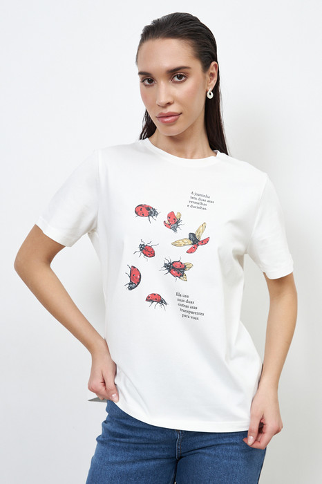 Джемпер свободного силуэта из хлопкового эластичного полотна. Втачной короткий рукав. Круглый вырез горловины оформлен бейкой.