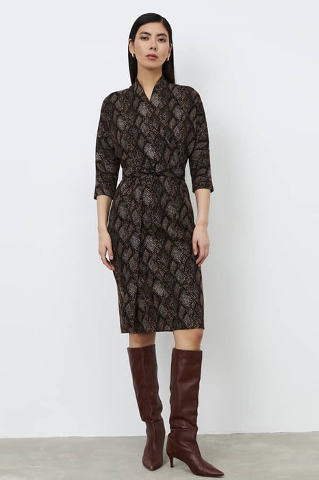 Платье из эластичного полотна с жаккардовым узором. Изделие свободное в верхней части и прилегающее в области талии и бёдер. Лиф изделия оригинального кроя в стиле кимоно. Цельнокроеная стойка переходящая в запах, визуально делает фигуру стройнее. По центру задней части платья выполнен шов, снизу небольшой разрез. В комплекте пояс. В таблице размеров представлены параметры человека, а не изделия.