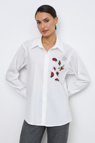Рубашка свободного силуэта из вискозной ткани с застёжкой на пуговицы. Низ изделия асимметричной длины (спинка удлинена относительно переда) с закруглениями по бокам и разрезами. Рубашечный рукав на манжете с застёжкой на пуговицы. Вырез горловины обработан отложным воротником на стойке. На задней части изделия выполнена кокетка с небольшой складкой. Достоинство этой модели в способности скрыть некоторые недостатки фигуры. Её можно сочетать как с брюками, так и с джинсами.