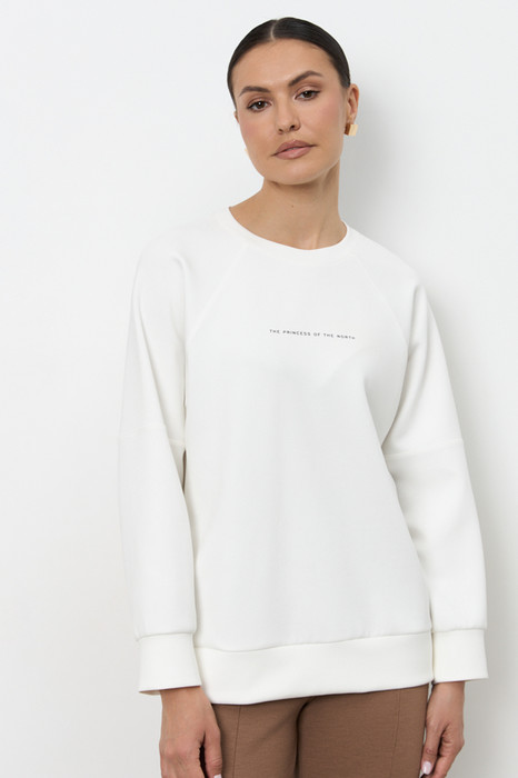 Свитшот из эластичного полотна свободного силуэта. Круглый вырез горловины оформлен бейкой. Рукав реглан с горизонтальным швом в области локтевого сгиба. По низу изделия и рукавов выполнены притачной пояс и манжеты из основной ткани. В таблице размеров представлены параметры человека, а не изделия.