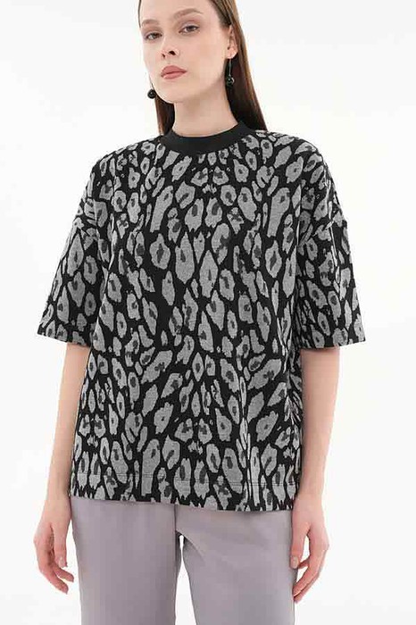 Джемпер свободного силуэта со спущенной линией плеча и рукавом до локтя выполнен из эластичного полотна. Вырез горловины оформлен подвязом. В таблице размеров представлены параметры человека, а не изделия.