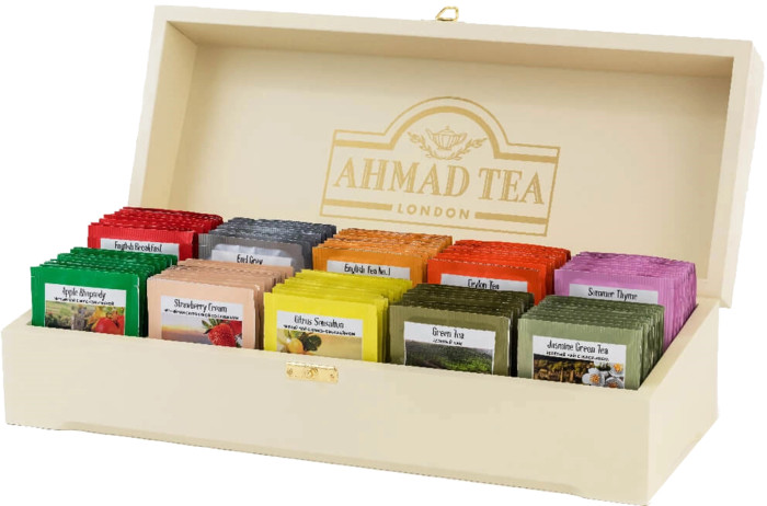 Это чайное ассорти - воплощение разнообразия и богатства чайного мира. В коллекции "Ahmad Tea" вы обязательно найдете вкус, который захочется попробовать именно сегодня.В набор входят десять вкусов: - смесь благородного цейлонского чая и чая из провинции Ассам с добавлением традиционного чабреца; - купаж высококачественного цейлонского чая с ароматом бергамота; - китайский зеленый чай с едва заметной горчинкой, легкостью и свежестью во вкусе; - китайский черный чай, смягченный сладостью чернослива в купаже; - купаж крепких сортов черного цейлонского, ассамского и кенийского чая; - китайский зеленый чай с лимоном и лаймом; - черный чай с десертным дуэтом клубники со сливками; - молочный улун для ценителей китайских зеленых сортов чая; - освежающая яблочно-мятная композиция на основе купажа черных чаев; - классический цейлонский чай, собранный на высокогорных плантациях острова Шри-Ланка.Ассорти станет отличным подарком на любой праздник! Деревянная шкатулка выглядит роскошно, что делает её прекрасным дополнением в любой интерьер.