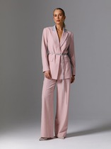 Брюки – из полотна с набивным рисунком в полоску, слегка зауженные книзу, с эластичной тесьмой по талии и притачными манжетами по низу. В центре переда по верхнему срезу прикреплен небольшой декоративный бантик из узкой атласной ленты.