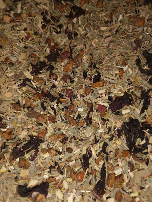 Каркадэ, сушеное яблоко, арбузные цукаты, лемонграсс, аромамасла с ярким ароматом арбуза.