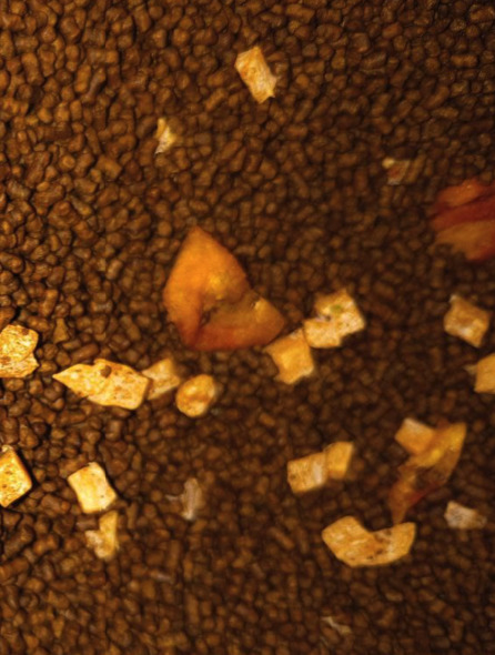 Гречиха темной обжарки, цукаты клубники и бананов, цитрусы.