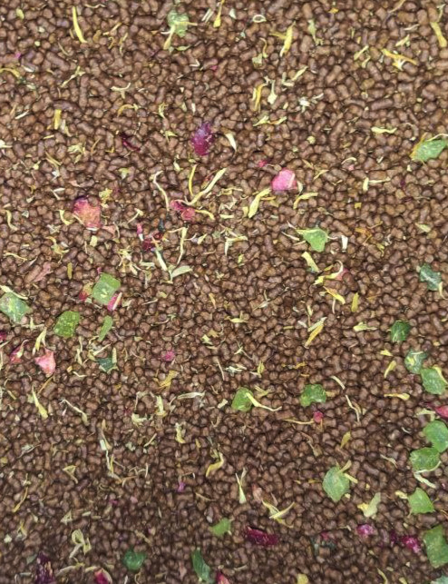 Гречиха темной обжарки, кусочки клубники, цукаты, лепестки календулы
