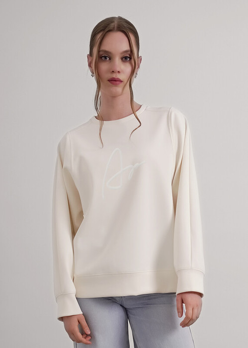 Джемпер из трикотажного полотна джерси фактурное, свободного кроя. Округлая горловина с обтачкой. Спереди по плечевому шву небольшая кокетка. По спинке рукав реглан, спереди рубашечный. По низу изделия и рукавов манжет. Спереди вышивка пеной.