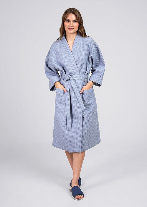 Женский халат из фактурного хлопкового полотна ""вафля"" на запах с поясом. Рукав полной длины, на переде накладные карманы.