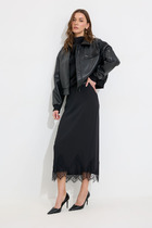 Юбка прямого кроя из трикотажного поливискозного полотна джерси длиной миди. Спереди средний шов, по спинке средний шов с молнией и разрезом. По талии потайная обтачка на резинке, боковые хлястики с пуговицей. По низу изделия потайной стежок.