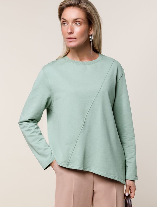 Состав: 92%Хлопок 8%ПУ Параметры модели на первом фото: Рост 172, бюст 88, талия 64, бедра 88Ассиметричный джемпер выполнен из премиального футера двухнитки. Спущенная линия плеча поддерживает расслабленный образ, который особенно хорошо будет сочетаться в костюме с брюками D44.122, D44.123 и D44.128. Наличие эластана в составе изделия гарантирует идеальную посадку и комфорт.