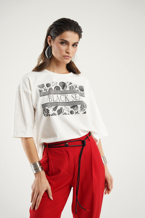 Блуза свободного покроя со спущенным рукавом. Вырез горловины- неглубокий округлой формы, с отрезной планкой. Перед декорирован печатью.