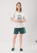 Халат женский из трикотажного полотна «кулирка» с набивным рисунком полуприлегающего силуэта, с горловиной овальной формы, окантованной основным материалом, короткими втачными рукавами с притачными манжетами. В боковых швах, смещенных в сторону полочки, обработаны карманы.